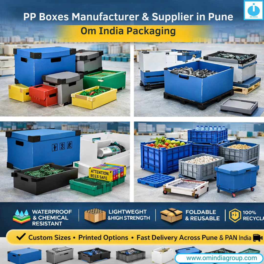 Om India Packaging is a trusted PP boxes manufacturer and supplier in Pune, offering durable and high-quality polypropylene packaging solutions for industrial and commercial use. PP boxes are widely preferred for their lightweight structure, strength, and resistance to moisture and chemicals, making them ideal for storage and transportation.